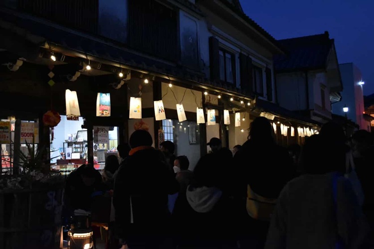翌日から始まる『筑後吉井おひなさまめぐり』の前夜祭として開催されるこのイベント。いつもは夕方に閉まる各店が、この日は特別に夜まで営業。夜の帳が下りるころから、ちょうちんの温かな灯りが白壁を照らし、非日常的な空間が広がります。各店を巡るスタンプラリーも実施。買い物や体験をしてスタンプを5個集めると、1回くじを引くことができます(景品は先着100人限定)。