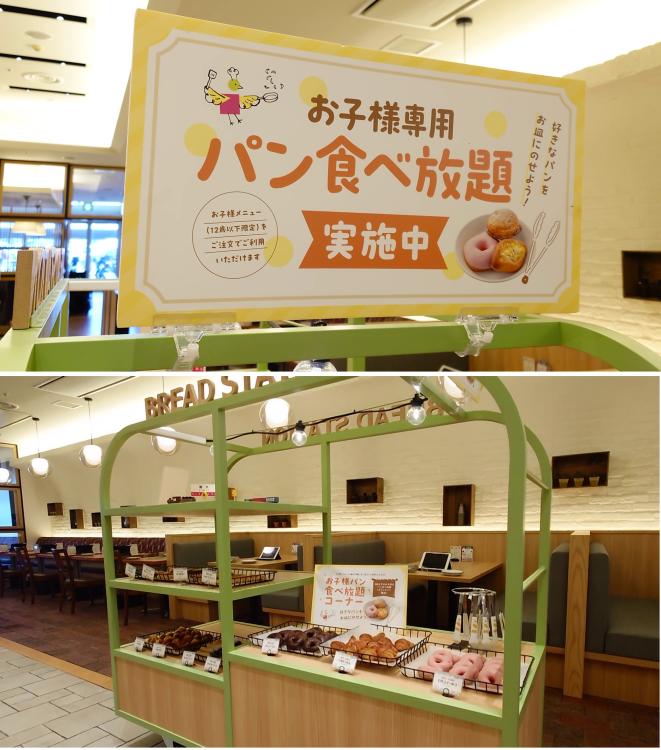 今回のリニューアルで新しく導入されたのが「お子様パン台」です。子どもが自分で選びやすいよう、あえて低い位置に11種類のパンがずらりと並びます。お子さん自身が好きなパンを自由にとって、食べ放題を楽しめるよう工夫されているのです。