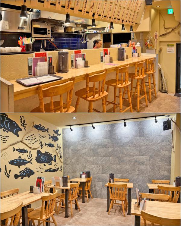 店内はカウンター席とテーブル席があり、奥の壁には魚のイラスト。