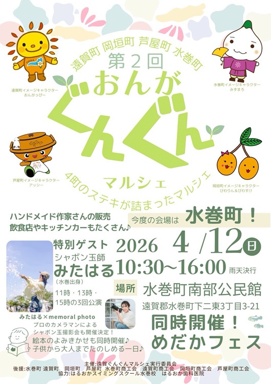 福岡県遠賀郡の魅力がぎゅっと詰まった『第2回おんがぐんぐんマルシェ』が、4月12日(日)に開催されます。会場は水巻町南部公民館(福岡・水巻町)。遠賀町・芦屋町・水巻町・岡垣町の4町から、地元で愛される人気店やこだわりのハンドメイド作家さんが一堂に会します。