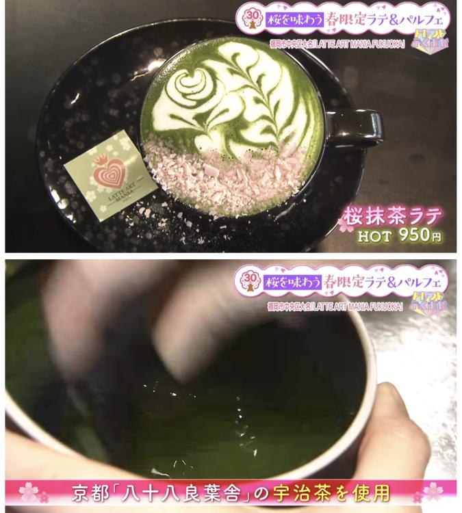京都「八十八良葉舎(はとやりょうようしゃ)」の宇治抹茶を使用。抹茶の苦味と桜の香りが合わさった、春を感じる本格的な1杯です。