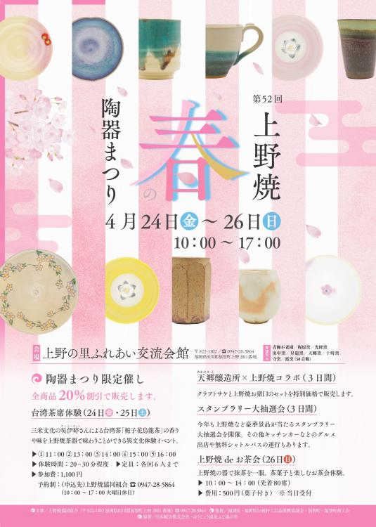 約400年の歴史を誇り、国の伝統的工芸品に指定されている「上野焼(あがのやき)」の祭典『第52回上野焼春の陶器まつり』が、2026年4月24日(金)から26日(日)までの3日間開催されます 。