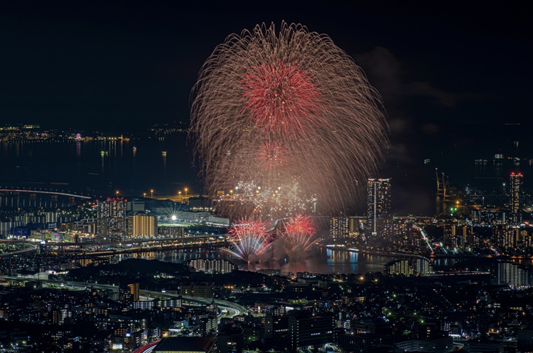 春の夜空を約7000発の花火が彩る、福岡市東区の風物詩。御島グリーンベイウォーク周辺の海岸から、大迫力の花火を間近で体感できます。