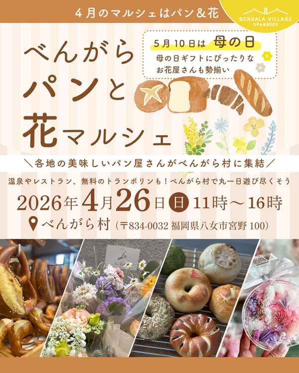 4月26日(日)、福岡県八女市の人気スポット「べんがら村」で『べんがらパンと花マルシェ』が開催されます。会場には、地元・八女や近隣市町村からはもちろん、福岡市や熊本市からもこだわりのパン屋さんが大集結!さらに今回は「花マルシェ」も同時開催。季節の切り花や苗、ガーデニング雑貨などが並びます。5月10日(日)の「母の日」にぴったりなプレゼントも見つかりそうですね♪