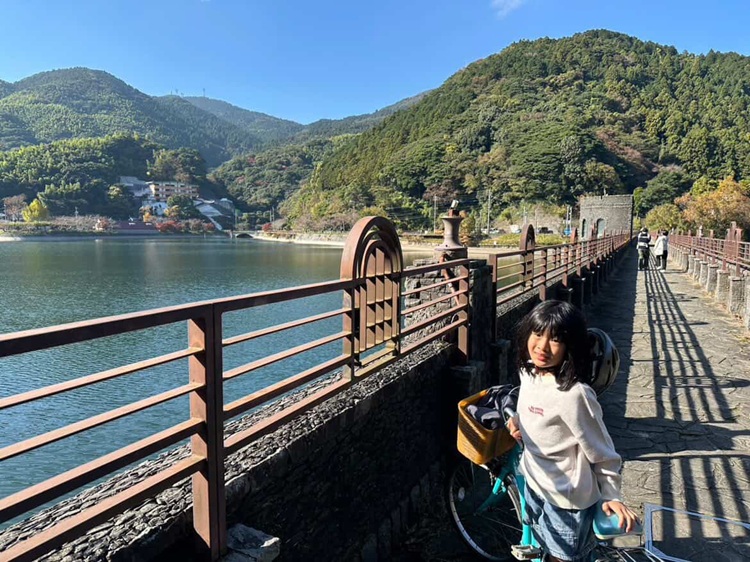 河内貯水池の周囲約6.9km。国指定の重要文化財「南河内橋」などもあり、景色を楽しみながら走ることができます。