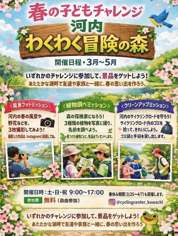 北九州市八幡東区の、豊かな緑と静かな湖畔に位置する「河内サイクリングセンター」。こちらで5月末までの土・日曜、祝日に開催されている『春のこどもチャレンジ 河内わくわく冒険の森』は、五感を使って楽しむ体験型アドベンチャー。風を切って走る「サイクリング」でも、一歩ずつ大地を踏みしめる「ウオーキング」でも、どちらのスタイルでも挑戦可能です!