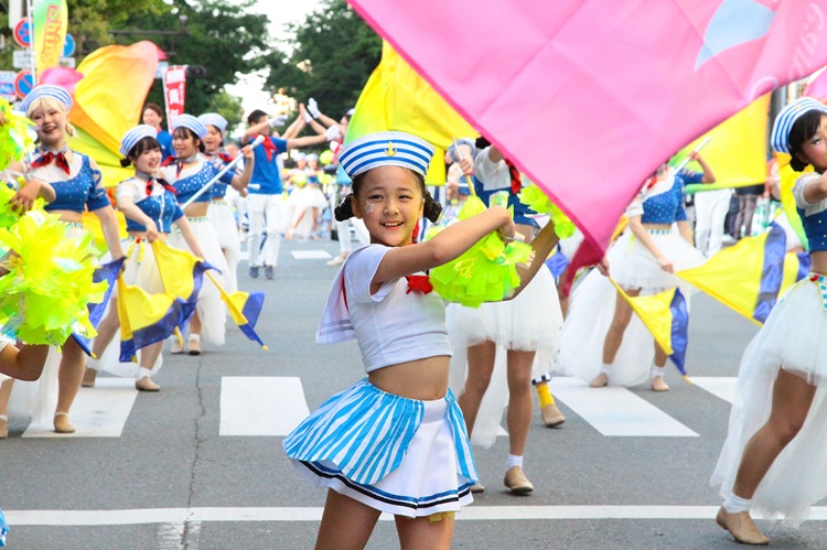 また、パレードの隊列を彩る「マーチング」の演奏は欠かせない見どころの一つ。全国トップレベルの実力を持つ地元の小・中・高校や大学の吹奏楽部に加え、警察、自衛隊の音楽隊が、一糸乱れぬ動きとともに力強い音色を響かせます。福岡市役所前広場に設置される「お祭り本舞台」でも、マーチングのステージパフォーマンスが披露されます。パレードでの堂々とした行進とはまた違う、大舞台ならではの洗練された演奏を間近で楽しめる貴重な機会です。