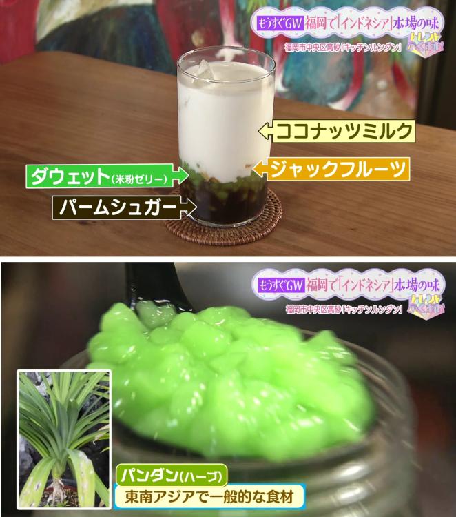 鮮やかなグリーンのゼリーの正体は「パンダン」というハーブ。パームシュガーのコクのある甘みとココナッツの風味が重なり、まるで黒糖のような濃厚な味わいが楽しめます。タピオカに次ぐブームを予感させる、新感覚のスイーツです。