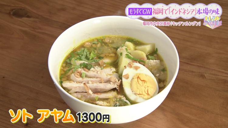 続いては、インドネシアの定番料理「ソト アヤム」(1300円)。鶏ベースのスープにたっぷりの野菜やゆで卵などが入った、ボリューム満点の具だくさんスープです。