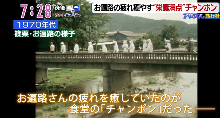 「いこい食堂」は、約60年前、敏子さんの母である、藤田澄子さんがオープンさせた食堂。当時、たくさんのお遍路さんが行き交う、人で賑わう通りに面したお店だったといいます。そこで人気だったのが「チャンポン」。巡礼中は、肉や魚介などを口にせず、歩き続けるお遍路さんの疲れを癒したのが食堂で提供していた「チャンポン」だったのです。1つの丼に野菜だけでなく、肉や魚介が入ったチャンポンは、それだけでご馳走であり、栄養が詰まった精がつく食べ物。巡礼終わりのお遍路さんにとってチャンポンは欠かせないものだったに違いありません。敏子さんが「お遍路さんがいたからこそ、篠栗にはチャンポンが根付いたといえると思います」と話すように、「チャンポン」は、お遍路さんの街である篠栗だからこそ生まれた、篠栗ならではのソウルフードなのです。