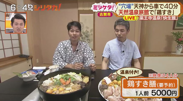 こちらの“鶏すき膳コース”、お値段は5000円なんですが、先ほど入った温泉もついているんです。